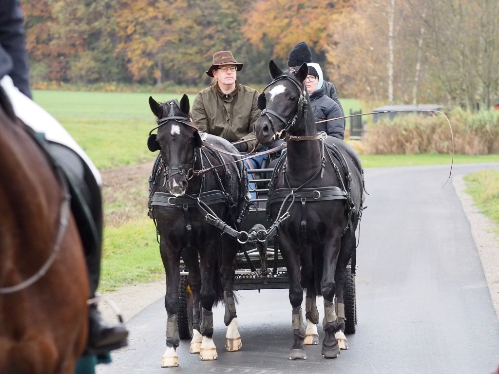 An einem schönen Herbsttag trafen wir uns um 10 Uhr an der Reithalle, um mit den Pferden zur Fuchsjagd zu starten. Erfreulicherweise konnten wir auch in diesem Jahr wieder Reiter aus anderen Vereinen zur Fuchsjagd begrüßen. Die Reiter wurden von zwei Kutschen und vier Planwagen begleitet, worauf auch die Jagdhornbläser, die Gäste des befreundeten Reiterverein aus Ennepetal und natürlich viele Vereinsmitglieder Platz fanden.